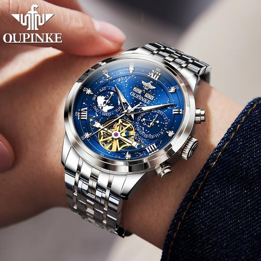 OUPINKE Watches for Men Automatic Unique Luxury Imitation Galaxy Mechanical Watch Business Diamond Calendar Male Watches Stainless Steel Waterproof Luminous